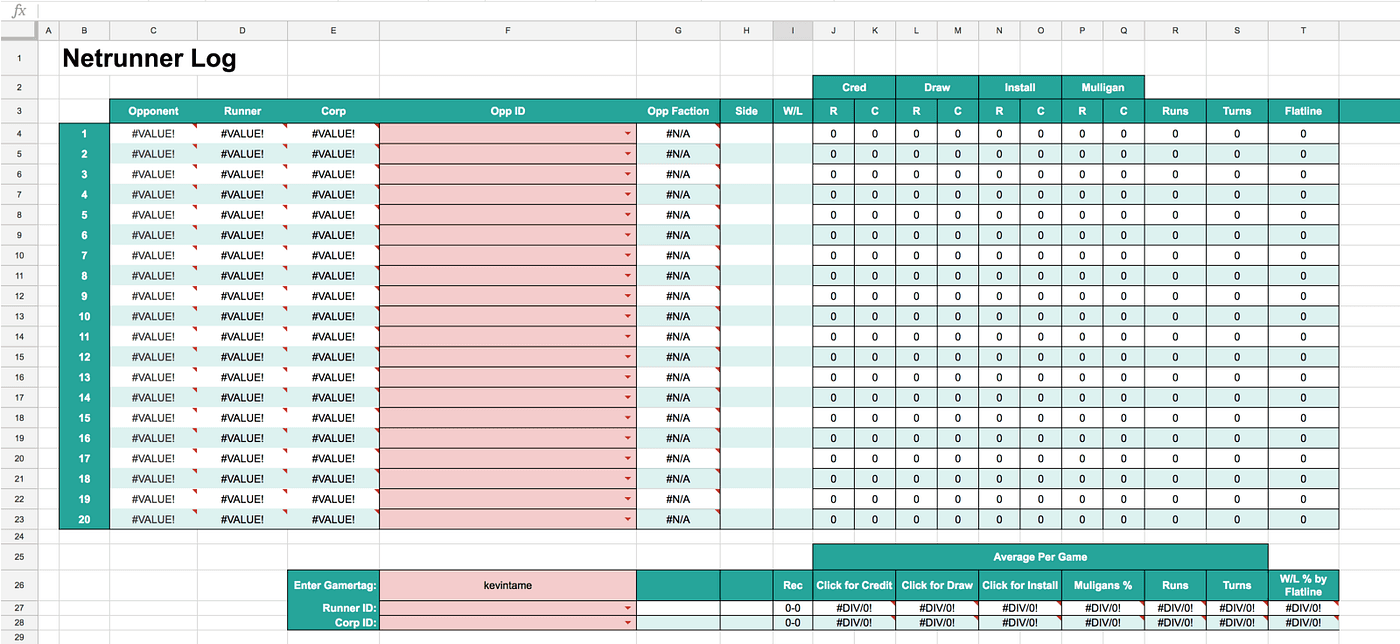 On Dan “Code Marvelous” Spinosa’s amazing podcast, “The Nerunner Quest”, I heard Nathan Foley describe a jintek.net tool that he had for analyzing the decks he built. I was extremely fascinated with this idea so I reached out to him directly and he shared with me what he had built. Over the next several weeks I improved upon it and made it a little more robust. Basically the tool allows you to copy the log of the game from JNet into the spreadsheet and then it will parse out the relevant data for you. It isn’t perfect and I don’t use it all the time but I believe it is a very helpful tool in understanding how a deck works and how your game went.